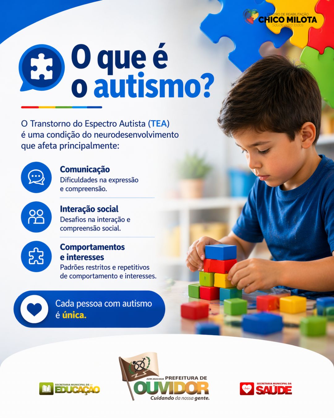 Entre os conteúdos divulgados, destacam-se explicações sobre o TEA como condição de neurodesenvolvimento que afeta, principalmente, a comunicação, a interação social e padrões de comportamento e interesses. As peças promovidas pela prefeitura ressaltam que entender as particularidades de cada indivíduo é o primeiro passo para promover respeito e empatia, pilares fundamentais para a inclusão.